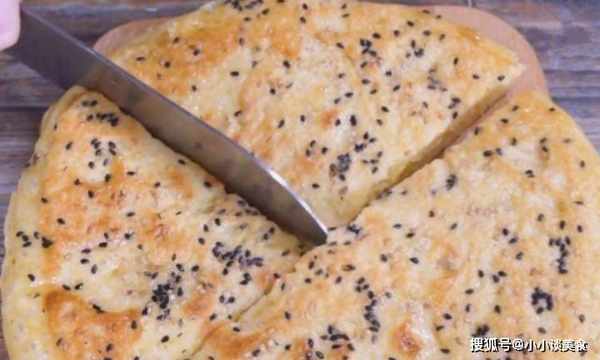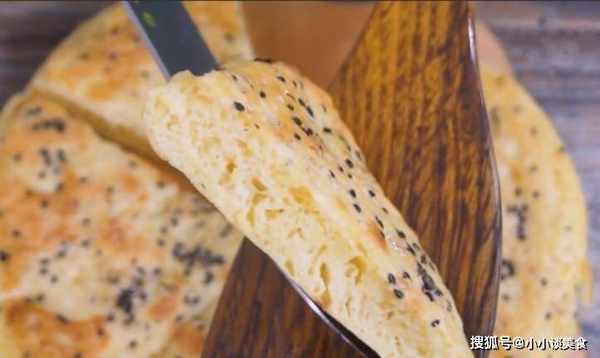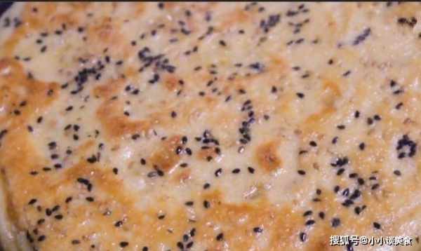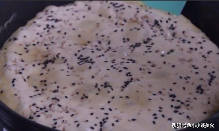 3、鍋裡加油,倒入所有面糊,將面糊抹平,然後在面糊表面撒上黑白芝麻,蓋上鍋蓋,用中火燉至底部凝固變形。然後翻過來再燉3分鐘,按一下很快彈回,說明熟透瞭,可以出鍋瞭。