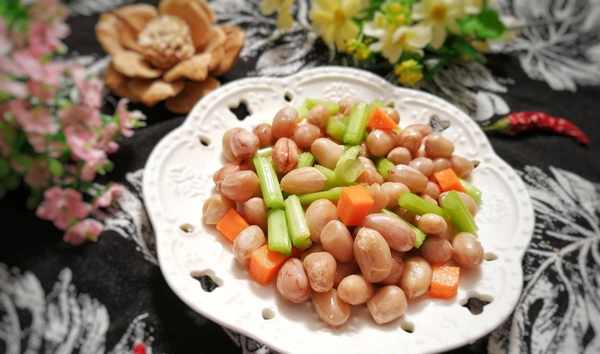 花生清洗幹凈,剝去外皮,放入水中煮熟。胡蘿卜和芹菜都切成小丁,開水焯燙一下。花生、芹菜、胡蘿卜加入少許鹽、糖、醋、香油拌勻即可,非常簡單。