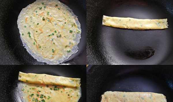 雞蛋打散,加入少許鹽,水淀粉攪拌均勻。小香蔥切成蔥花,胡蘿卜擦成細絲放入雞蛋液中攪拌均勻。鍋中刷一層食用油,油熱後倒入一勺雞蛋液,快速轉動鍋子,使蛋液均勻的攤開形成一個薄薄的蛋餅。蛋液定型後,從一邊將雞蛋餅卷起,然後繼續倒入蛋液,趁蛋液沒有完全凝固,繼續向另一邊卷起蛋卷。反復將所有蛋液卷成蛋卷為止。卷好的蛋卷切成小段即可食用。
