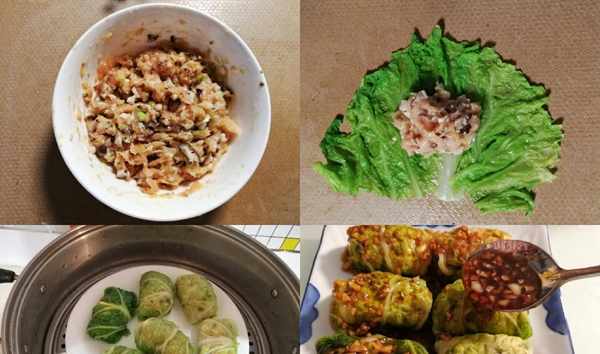 2、掰下幾片白菜葉,清洗幹凈,在開水中焯燙1分鐘左右使白菜葉變軟,撈出過涼瀝幹水分。將焯好水的白菜葉平鋪,放上和好的肉餡兒,包起來。
