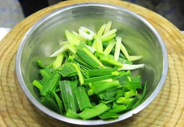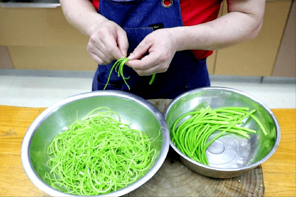 1.準備一把蒜苔把根切掉,然後把蒜苔洗幹凈,汆煮一下。鍋內加入清水,放入一小勺堿面。加堿面,煮出來的蒜苔更加脆嫩。水燒開以後放入蒜苔 ,大火煮一分鐘,蒜苔斷生變軟以後撈出來,過涼。