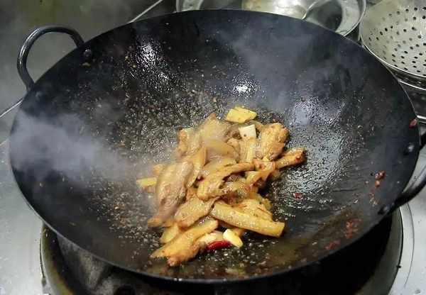 2.炒之前一定要先滑鍋,把油燒至冒青煙時倒出來,重新加入涼油,熱鍋涼油炒肉絲時才不容易粘鍋,把肉絲倒入鍋中煸炒出肉香味,倒入蔥、薑和幹辣椒爆出香味,淋入少許生抽,加入適量的食鹽、味精、雞粉、蠔油調味。