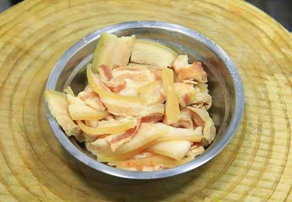 2.鍋內加入清水,放入豬肉和蔥薑片,撒入一小把花椒,倒入一點料酒,水燒開以後打去鍋中的浮沫,轉小火燜煮20分鐘,煮至七八成熟,用筷子輕輕一紮沒有血水溢出即可,把豬肉取出來放入涼水中冷卻一下,切成2毫米左右的薄片。
