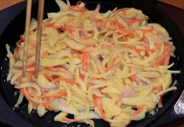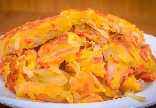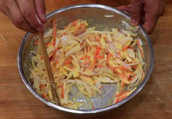 1.準備洗凈的小洋蔥三個,切成細絲;胡蘿卜半根也切成細絲,放在同一個盆中,打入3個雞蛋,雞蛋能使烙出的餅更加軟嫩,加入食鹽2克,雞粉2克,加入面粉50克,攪拌至餡料成團即可。