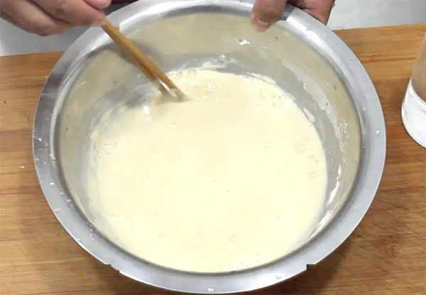 2.準備面粉60克,加入食鹽2克,雞粉2克,十三香1克,打入2個雞蛋,雞蛋能使做出的餅口感更軟嫩,營養豐富,這時我們少加一點水,把面粉攪成面糊,攪拌至沒有面疙瘩,再次加入70克涼開水攪拌均勻。