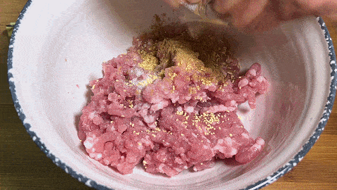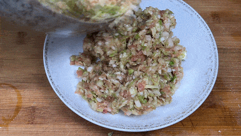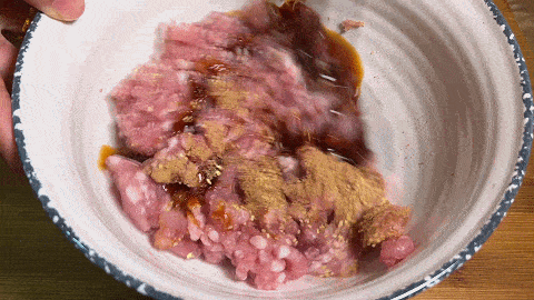 17. 將放涼的熱油倒入肉餡中,再次拌勻