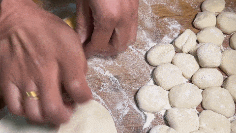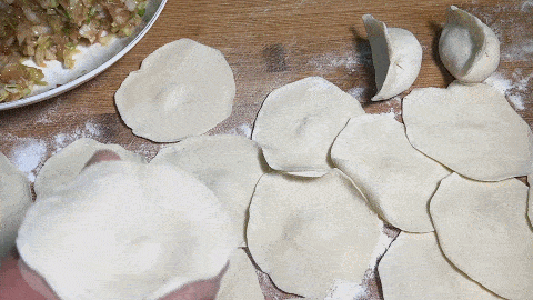 7、 用手揪的方法揪成面劑,然後搟成四周薄中間厚的餃子皮