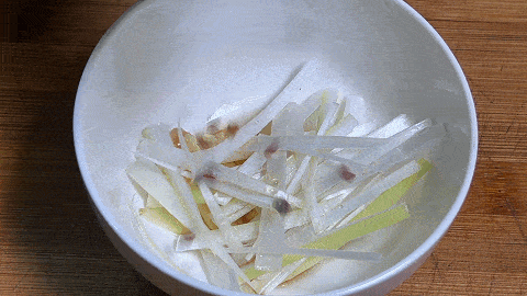 5. 生薑一塊切成薑片,再改刀切成薑絲,放入碗中