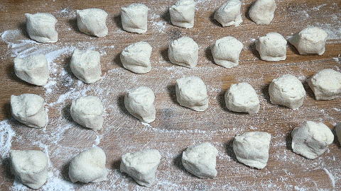 22. 將醒好的面團放在案板上,揉成長條,然後用手揪的方法揪成一個個小面劑