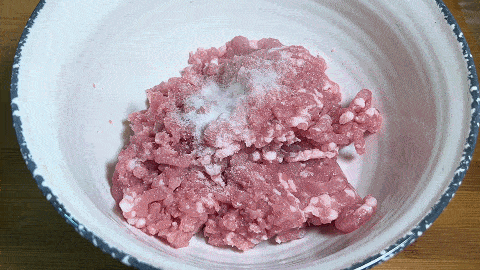 13. 將攪好的肉餡放入大碗中,加入食鹽,雞精