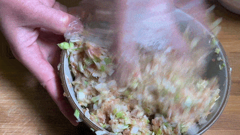 16. 第二次加入蔥薑水拌勻,讓肉餡吸飽水分