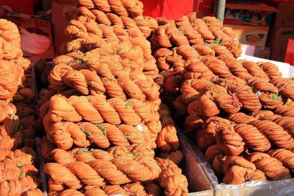 桂發祥十八街麻花,天津傳統名點,桂發祥也是天津市的百年老字號麻花店。相傳在清朝末年,天津城中有一條叫做“十八街”的巷子,巷子裡有一個麻花店叫做桂發祥,老板炸麻花都是使用最好的材料,並且炸麻花技術也十分高超,有一次他外出旅遊歸來,因剛到傢,懶得做飯,可看瞭半天隻發現有一些剩點心,於是想到直接用麻花面包裹著點心進行油炸,結果炸出來的麻花跟以前的口味完全不一樣,十分美味,根據這個方法,老板於是制作瞭各式各樣不同口味的麻花,使得其的麻花成瞭十八街最有名的,後來這種麻花就統稱為“桂發祥十八街麻花”。