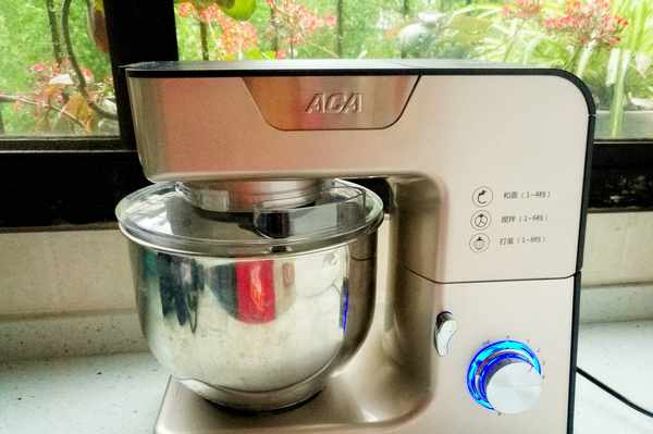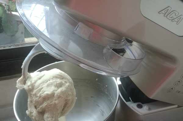 放好攪拌桶,壓下機頭,啟動廚師機1檔慢速攪拌1分鐘成團,然後啟動廚師機3檔揉面3分鐘。