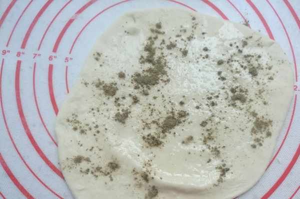 搟成片,撒上適量鹽,少許油刷勻,撒一層花椒粉。