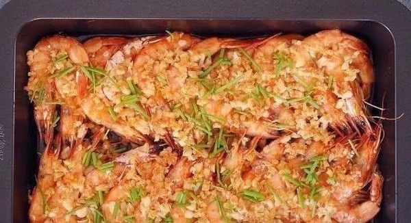 2.蒜頭爆香,加入適量鹽出鍋待用。在烤盤上塗上油,然後將蝦擺好。