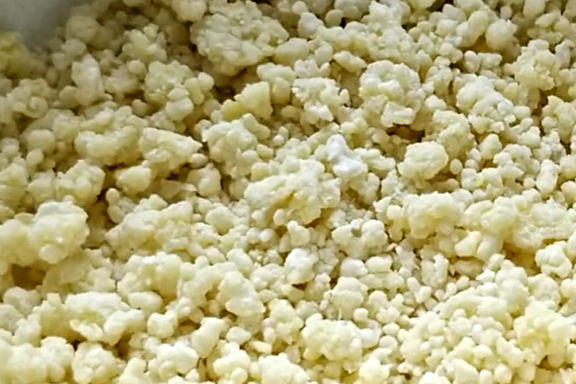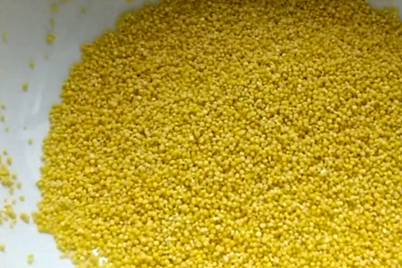 第二步:在鍋裡倒上水燒開,把洗幹凈的小米倒進去煮6分鐘,小米煮好後撈出來,在小米裡面加上面粉120克,讓每粒小米都均勻裹上一層面粉。