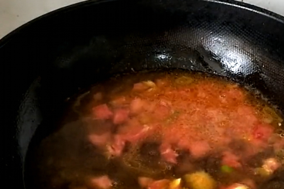 第三步:在鍋裡倒上油,放上蔥薑、西紅柿和食鹽炒出汁水,再倒上適量的清水,開大火煮開。