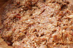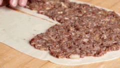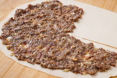 拌好的牛肉餡均勻鋪在餅皮上,四周留空,並在切口右側留出1/4空白處(註意肉餡厚度要與餅皮厚度盡量保持一致)。