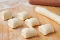 將靜置好的面團取出,放在撒瞭少許面粉的案板上,搓成長條,分成60g每等份,分好的面團用保鮮膜蓋上,避免水分流失。