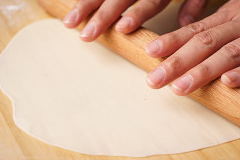 60g面團用手心按扁,用搟面杖搟成直徑約12cm、厚度不超過2mm的薄片,以中心點為起點,切一刀,餅皮完成。