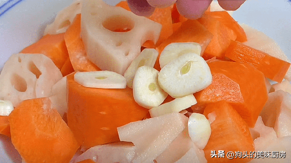 9.準備一個大盆,放入蓮藕跟胡蘿卜,再加點大蒜片。