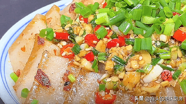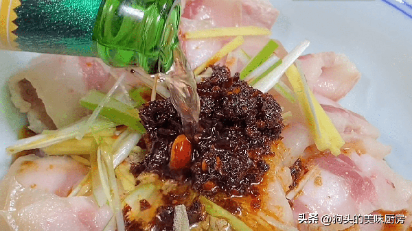 12.蒸熟的豬肉取出來,表面倒入前面調好的萬能調料就可以瞭。