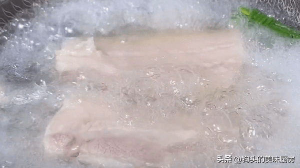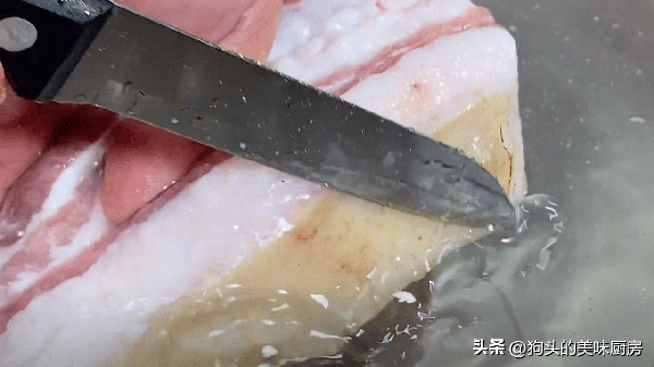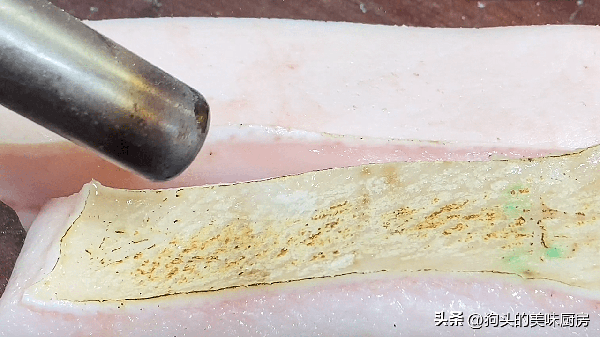 1.準備一小條的五花肉,對半切開,用火槍噴一下表面的豬,去去腥味。沒有噴槍就把鍋燒熱燙幾下。