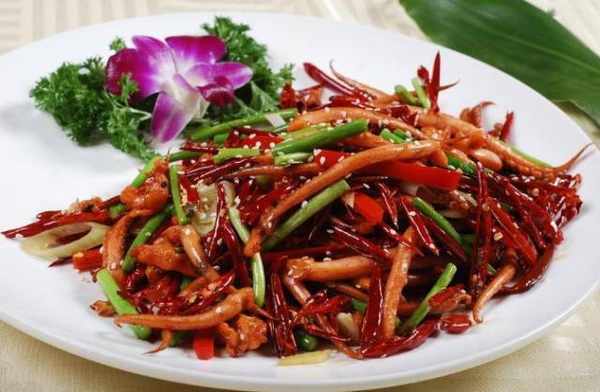 4、熱鍋溫油,下魷魚須、薑蒜片、花椒粒、幹辣椒翻炒