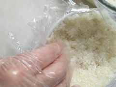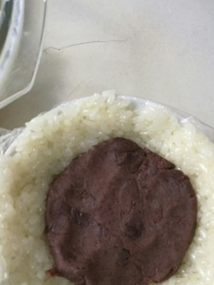 帶好一性手套,把米飯一點點鋪在碗中,並且用手輕輕按壓這樣做的成品表面就不會松散瞭,中間略凹空出便於放豆沙