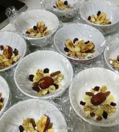 在蒸糯米時可準備幹果的擺盤,我喜歡用吃飯的小碗做,每個做出來小小的35O克左右,先用大點的保鮮膜鋪在碗中,然後在保鮮膜上擺放各種幹果,果幹要反著放。