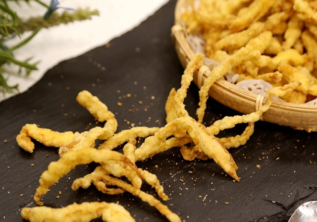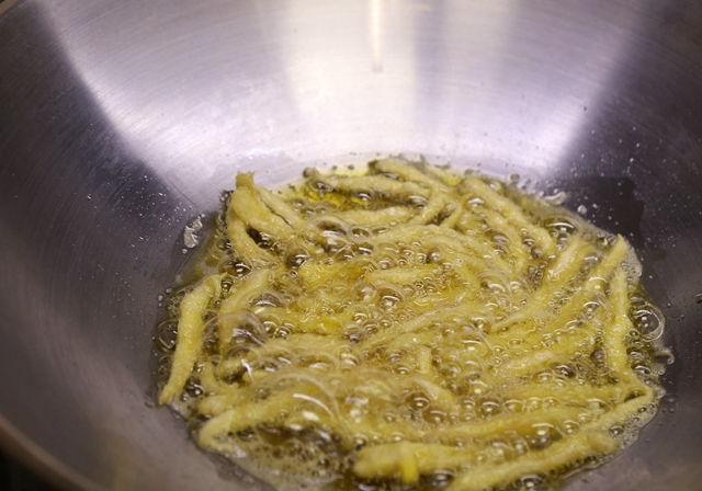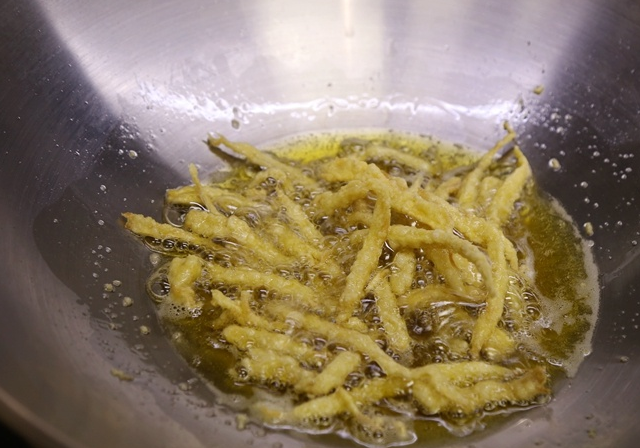 6、鍋裡加入適量油,燒到6成熱時下入杏鮑菇中小火炸。