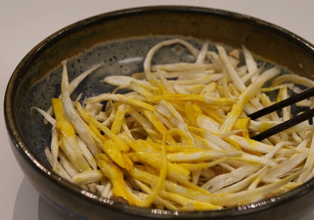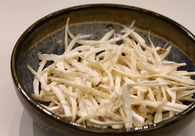 2、將杏鮑菇撕成絲。