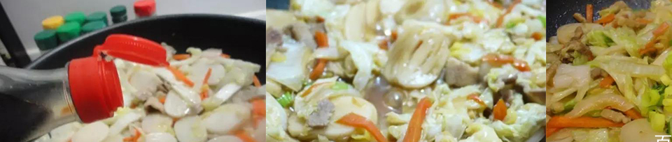 5、之後入剩下的白菜葉絲部分,蓋上鍋蓋悶一下(因為白菜會出很多水,所以我就沒另外加水);悶個幾分鐘後,開鍋拌炒(這可以看到鍋內有不少的湯汁,這些都是白菜出的湯。除瞭紹興酒,我沒加任何一滴水喔~),起鍋前加入蔥綠拌一下後即可上桌。