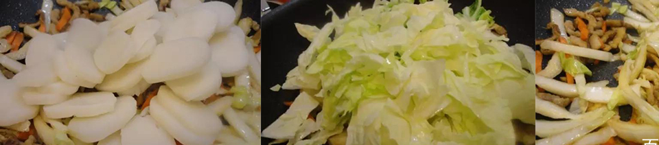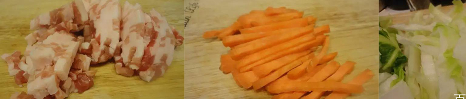 1、豬肉片切絲備用,蔥切蔥花,蔥白蔥綠分開;蒜頭去皮切碎;紅蘿卜切絲備用;白菜洗凈切粗絲,梗與葉子分開備用;