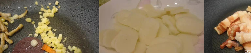 2、半包年糕片放入盤子裡備用(現在外面賣的寧波年糕片已經切好用真空包裝。一打開就片片分明,不需要再另外處理,非常方便);鍋子內不須放油,放入肉絲炒至變色,逼出豬油,肉絲移至一邊,放入蔥白爆香;