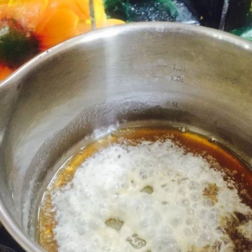 第2步、糖漿略微變色後,轉小火,註意觀察糖漿顏色