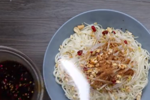 8、把準備好的面條,醬油、辣椒油、小蔥段、花生碎一起放到一個碗中,然後用筷子攪拌就可以開吃啦。