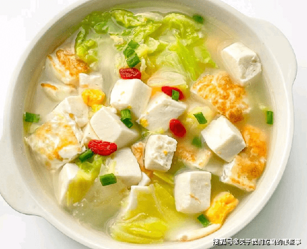 2、鍋裡留底油,放入蔥花爆香,倒入白菜大火翻炒一會兒,變軟後加入豆腐塊炒一會兒,加入適量清水,大火煮開,放入荷包蛋,大火煮5分鐘,湯汁濃白後加入食鹽、胡椒粉調味,即可出鍋。