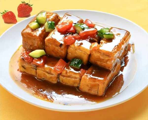 方方正正的豆腐被整齊地擺放在盤子裡,澆一勺紅彤彤的芡汁,外面的豆腐炸至金黃,咬一口,豆腐裡瘦肉、冬筍、香菇、海米細剁成末,用蔥薑炒得噴香,滿滿都是餡兒,有一種“開箱取寶”的驚喜感。皮韌餡嫩的濃香口感,你千萬不能錯過。