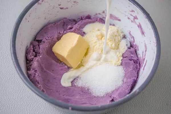 2、芋頭和紫薯中加入50g奶粉、15g白砂糖、20g黃油、50g牛奶,攪勻後捏成紫色泥狀。(這個比例的甜度適中,如果想控油控糖,可以適當減少用量)