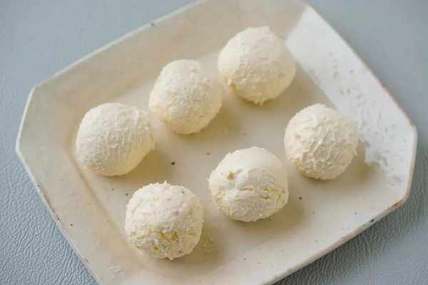 3、將芋泥分成75g/個的劑子,將奶油奶酪切成25g/個的小塊揉圓,餡心可以放冰箱冷凍一下,會比較好包。