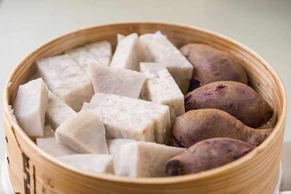 1、將芋頭去皮切塊、紫薯洗凈一起放入蒸鍋大火蒸20分鐘後取出,再將紫薯去皮。