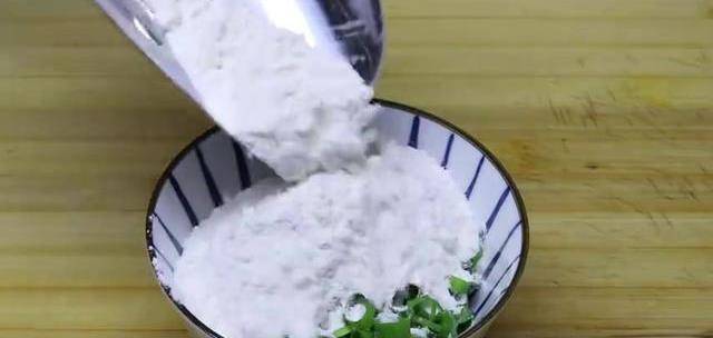 下面時間準備兩根免費的小蔥切碎,切好,收到碗中加點食用鹽,十三香、50克面粉,澆上熱油激發出香味,最後攪拌均勻,放到一旁備用。面條像這樣就醒發好瞭,有密集的蜂窩組織,案板上提前撒點面粉防粘。