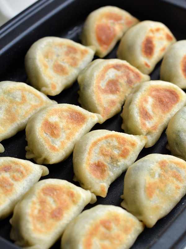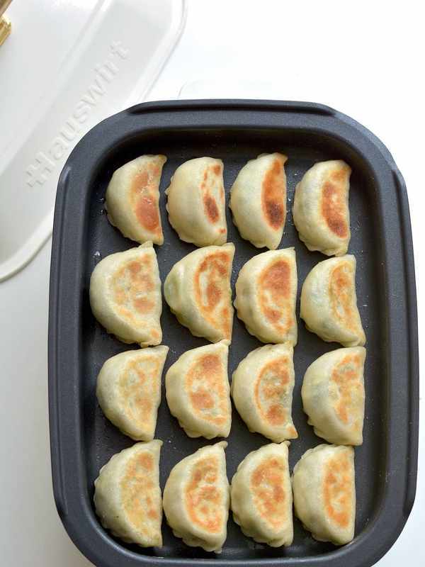 8.每包好一個餃子就直接放在煎鍋裡,直到碼滿為止;加熱前再沿著餃子邊緣淋一些植物油(份量外),先大火加熱,再轉中小火,底部定型並且出現焦黃;