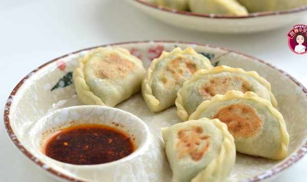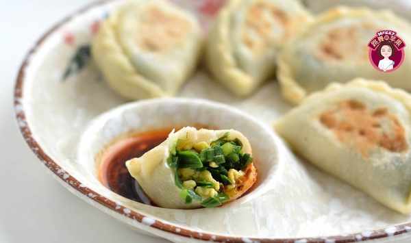 9.因為餃子比較飽滿,可以翻身煎,再淋一點點水,蓋蓋子燜2分鐘;餡是雞蛋韭菜素餡的,隻要將餃子3面煎熟煎焦黃就可以出鍋瞭。吃時可以蘸著醋和辣椒油,不管是做早餐還是午餐、晚餐,都是快手有營養的小吃。