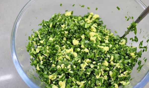 5.韭菜切成碎末,與晾涼的雞蛋塊同入大碗中,倒少許芝麻香油提香,同時也是鎖住韭菜切面,防止韭菜汁過多滲透出來,臨包餃子之前再撒鹽,混合均勻;
