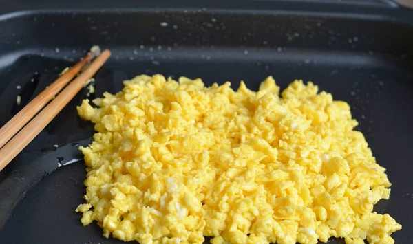 4.炒鍋中倒適量油,油有些溫熱時將雞蛋液倒入鍋中,用筷子不停地攪拌,隨著雞蛋液的凝固和筷子的攪動,很快就出現瞭大小均勻的雞蛋塊;雞蛋晾涼後使用;