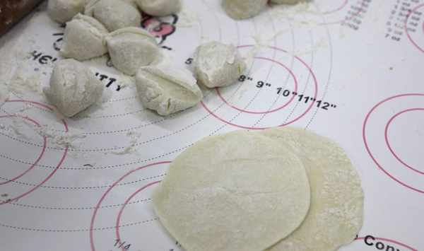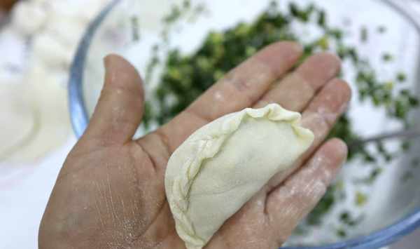 7.取適量餡放在皮上,按自己的手法包成餃子狀,想好看再捏幾個花邊,更顯餃子飽滿;