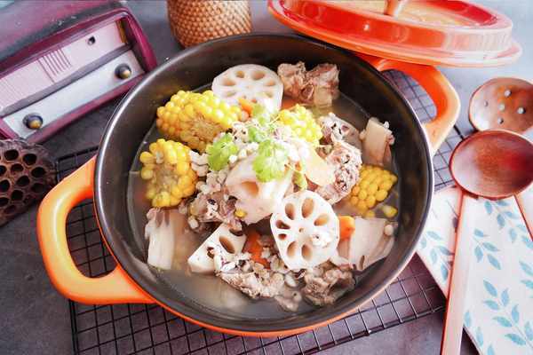 準備食材:蓮藕500克,芡實20克,薏米50克,甜玉米1個,胡蘿卜1根,排骨500克,香菜1根,料酒5毫升,鹽5克,清水適量