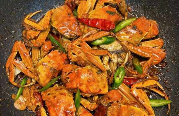 食材:螃蟹5個,薑絲少許,蒜8瓣、小蔥3根,幹辣椒8個,花椒少許,料酒